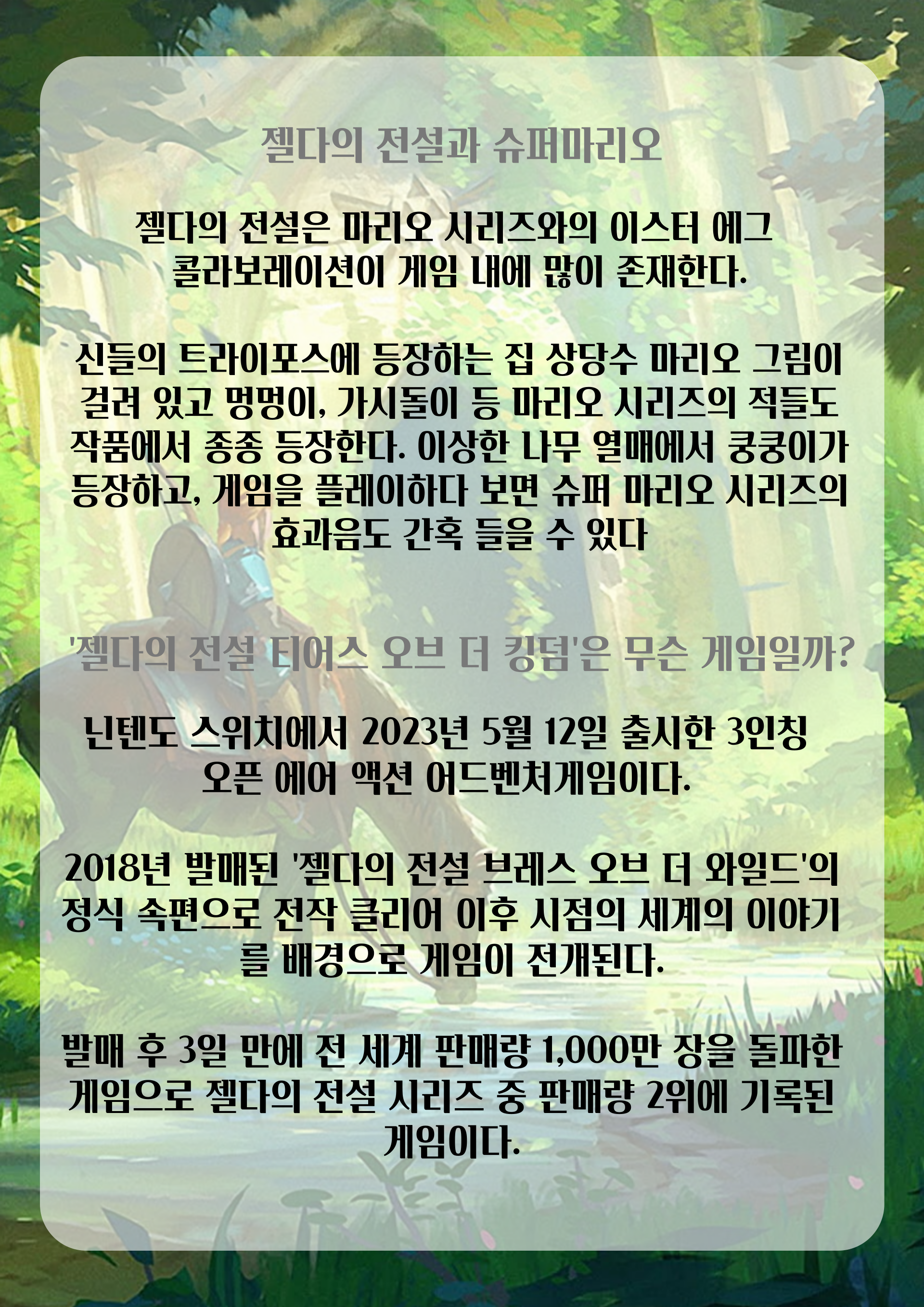 2018년 발매된 '젤다의 전설 브레스 오브 더 와일드'의 정식 속편으로 전작 클리어 이후 시점의 세계의 이야기가 전개됩니다.