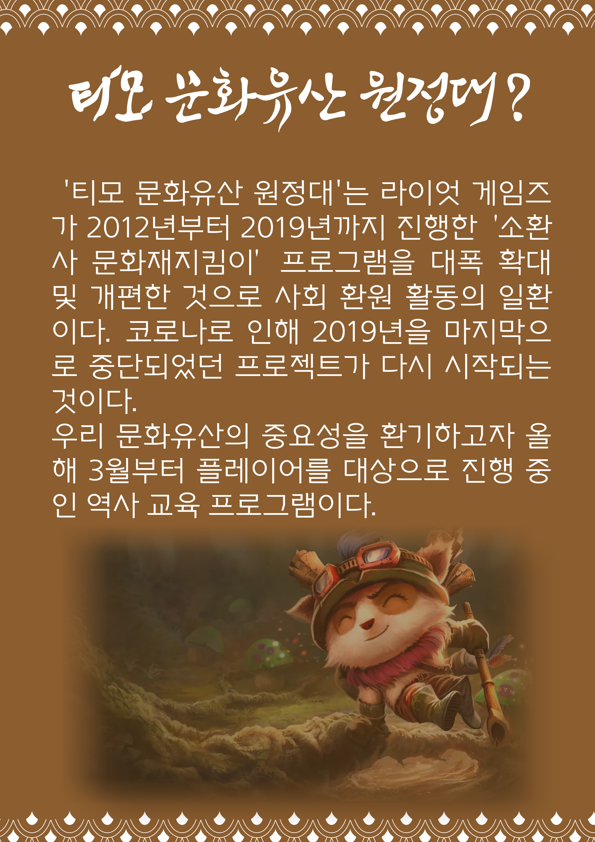 라이엇 게임즈는 플레이어 중심이라는 철학을 배경으로 지난 2011년 한국 시장 진출 시기부터 사회공헌활동을 계획했고 그 중 하나가 <티모 문화유산 원정대>이다.