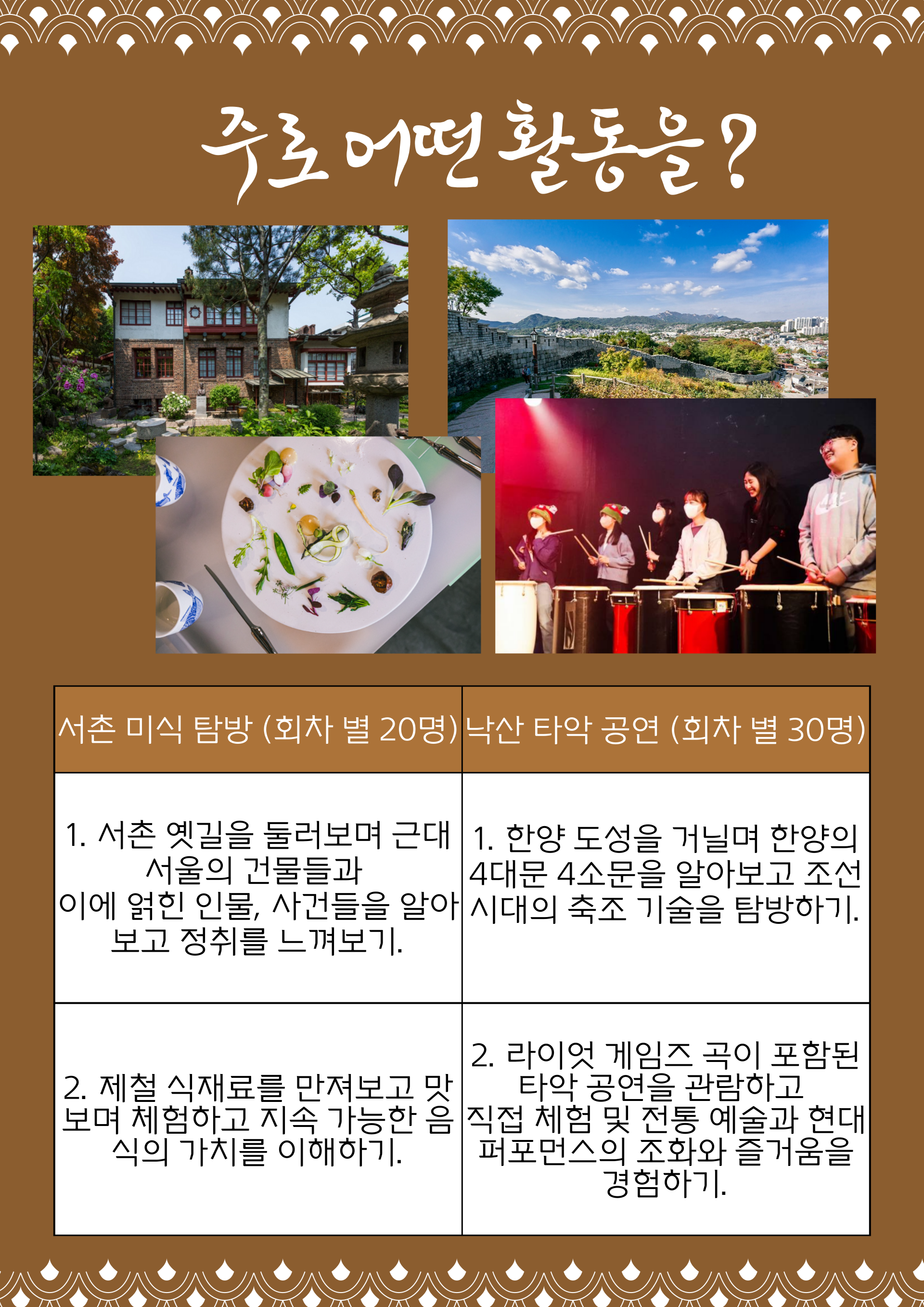 이번 하반기에 실행되는 프로그램에서는 서촌 미식 탐방 및 낙산 타악기 공연 체험이 교차로 진행될 예정이다.