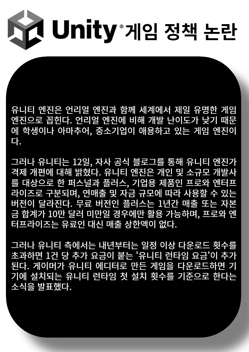 그러나 유니티는 12일, 자사 공식 블로그를 통해 유니티 엔진가격제 개편에 대해 밝혔다. 유니티 엔진은 개인 및 소규모 개발사를 대상으로 한 퍼스널과 플러스, 기업용 제품인 프로와 엔터프라이즈로 구분되며, 연매출 및 자금 규모에 따라 사용할 수 있는 버전이 달라진다. 무료 버전인 플러스는 1년간 매출 또는 자본금 합계가 10만 달러 미만일 경우에만 활용 가능하며, 프로와 엔터프라이즈는 유료인 대신 매출 상한액이 없다.