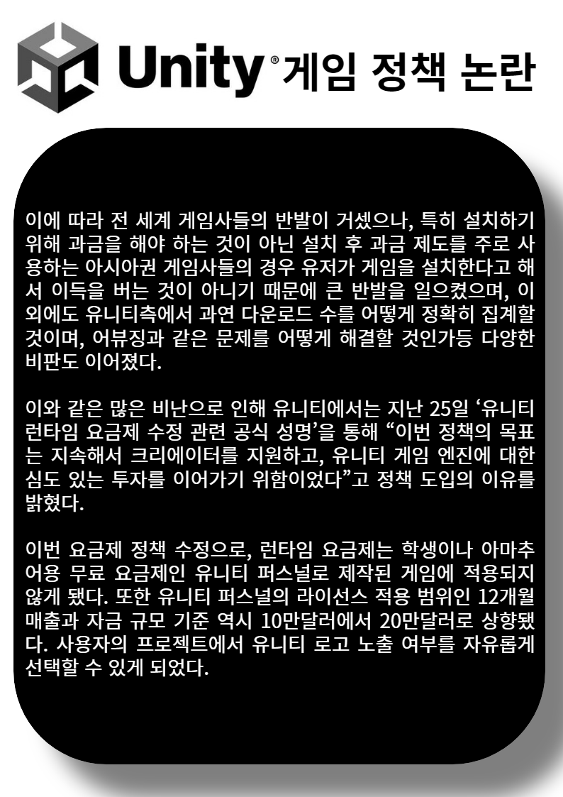 이와 같은 많은 비난으로 인해 유니티에서는 지난 25일 ‘유니티 런타임 요금제 수정 관련 공식 성명’을 통해 “이번 정책의 목표는 지속해서 크리에이터를 지원하고, 유니티 게임 엔진에 대한 심도 있는 투자를 이어가기 위함이었다”고 정책 도입의 이유를 밝혔다.