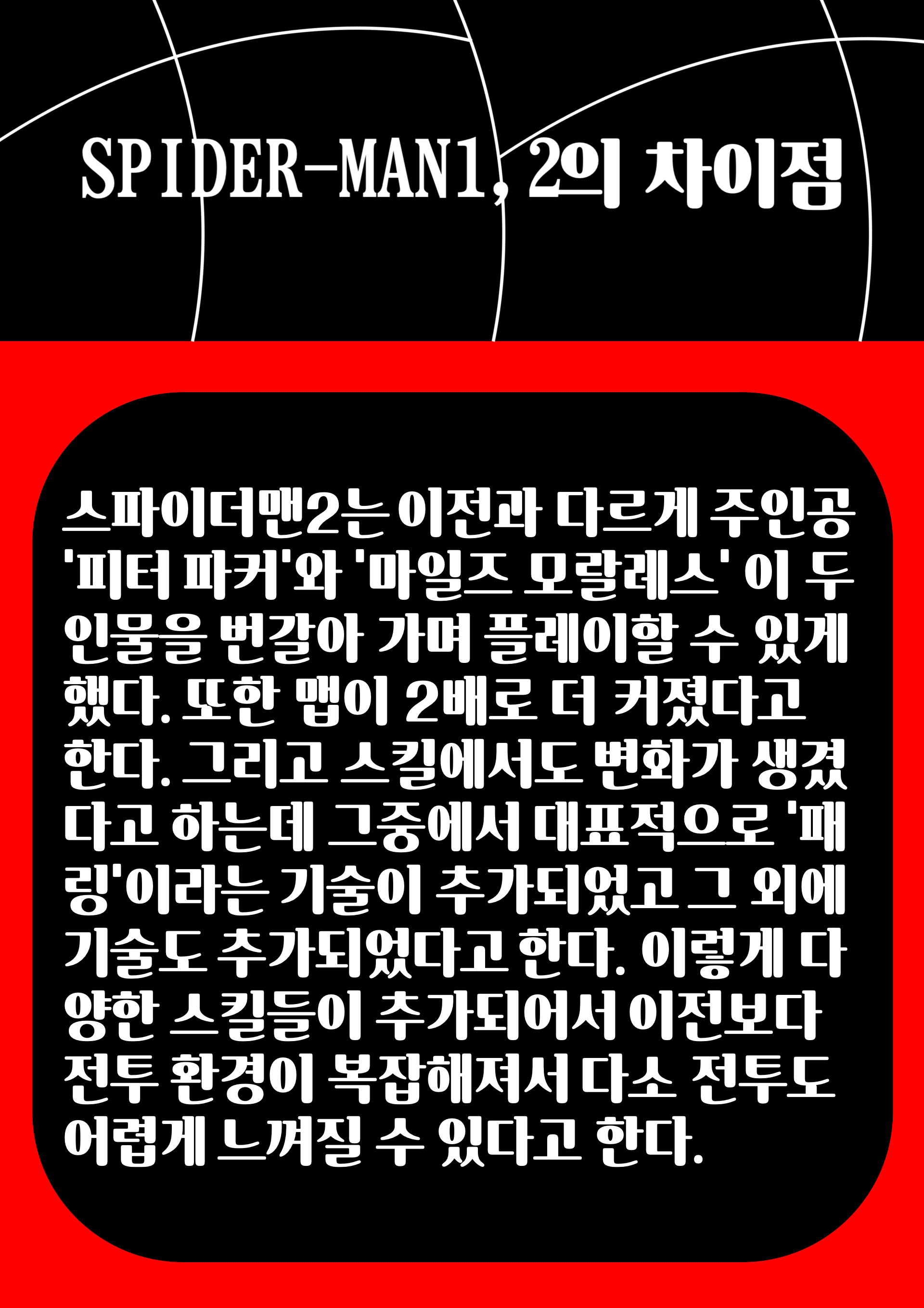 스파이더맨2는 이전과 다르게 주인공 '피터 파커'와 '마일즈 모랄레스' 이 두 인물을 번갈아 가며 플레이할 수 있게 했다. 또한 맵이 2배로 더 커졌다고 한다.