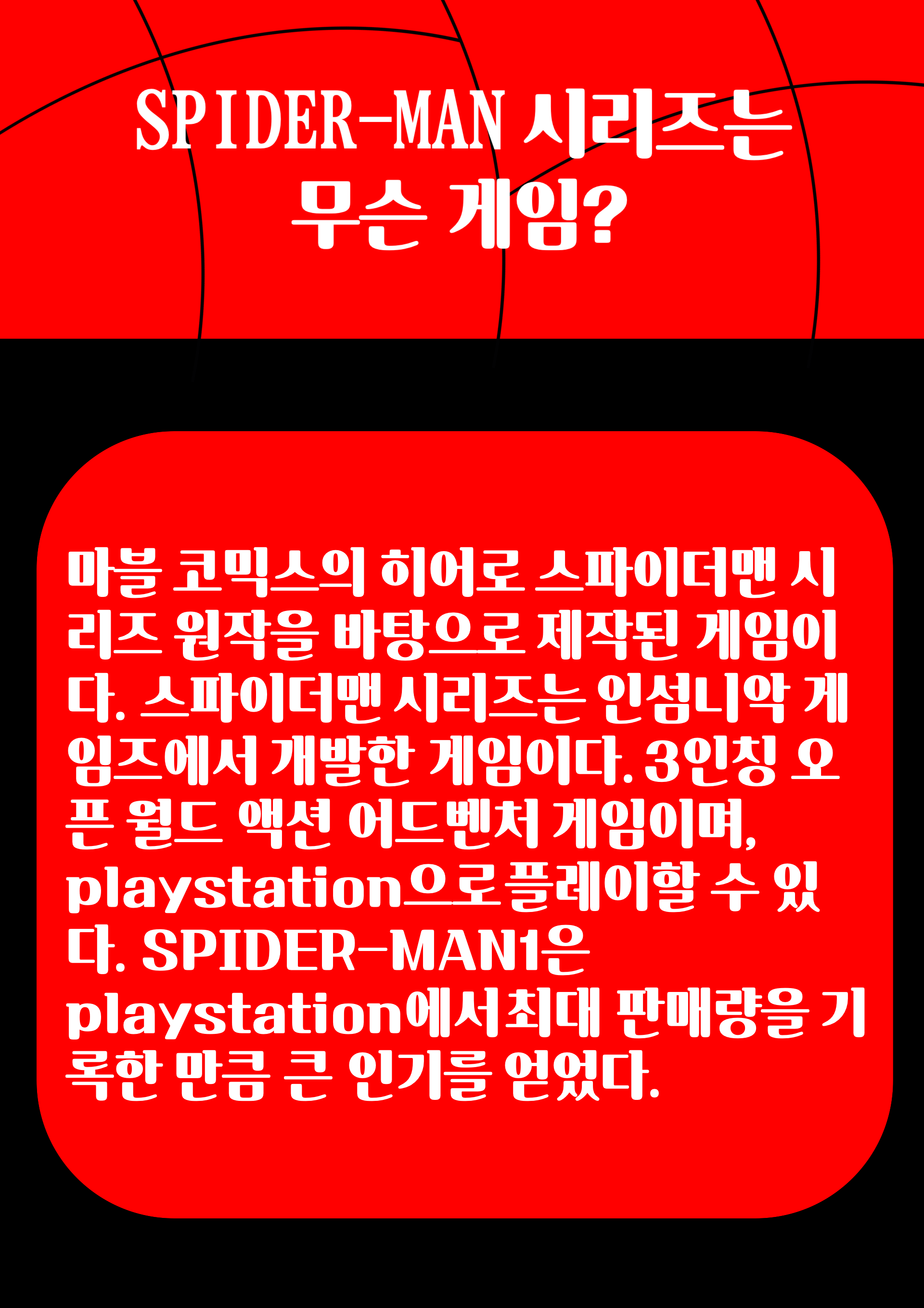 스파이더맨 시리즈는 인섬니악 게임즈에서 개발한 게임이다. 3인칭 오픈 월드 액션 어드벤처 게임이며, playstation으로 플레이할 수 있다.