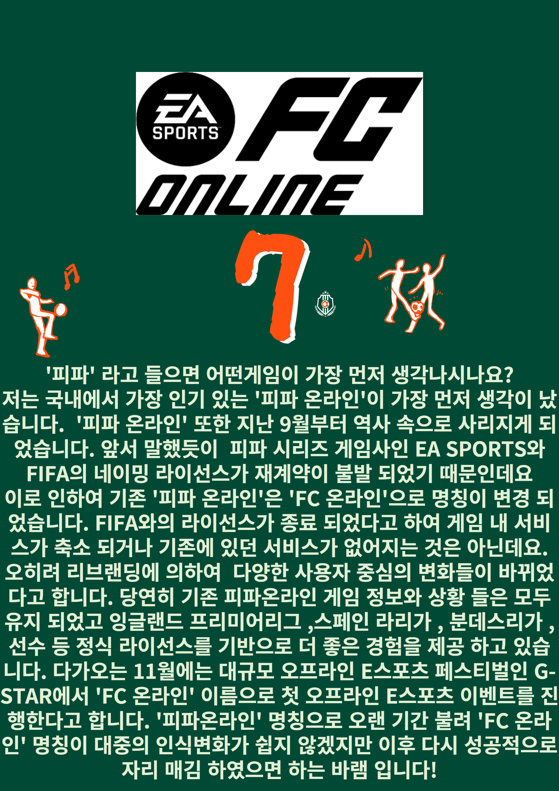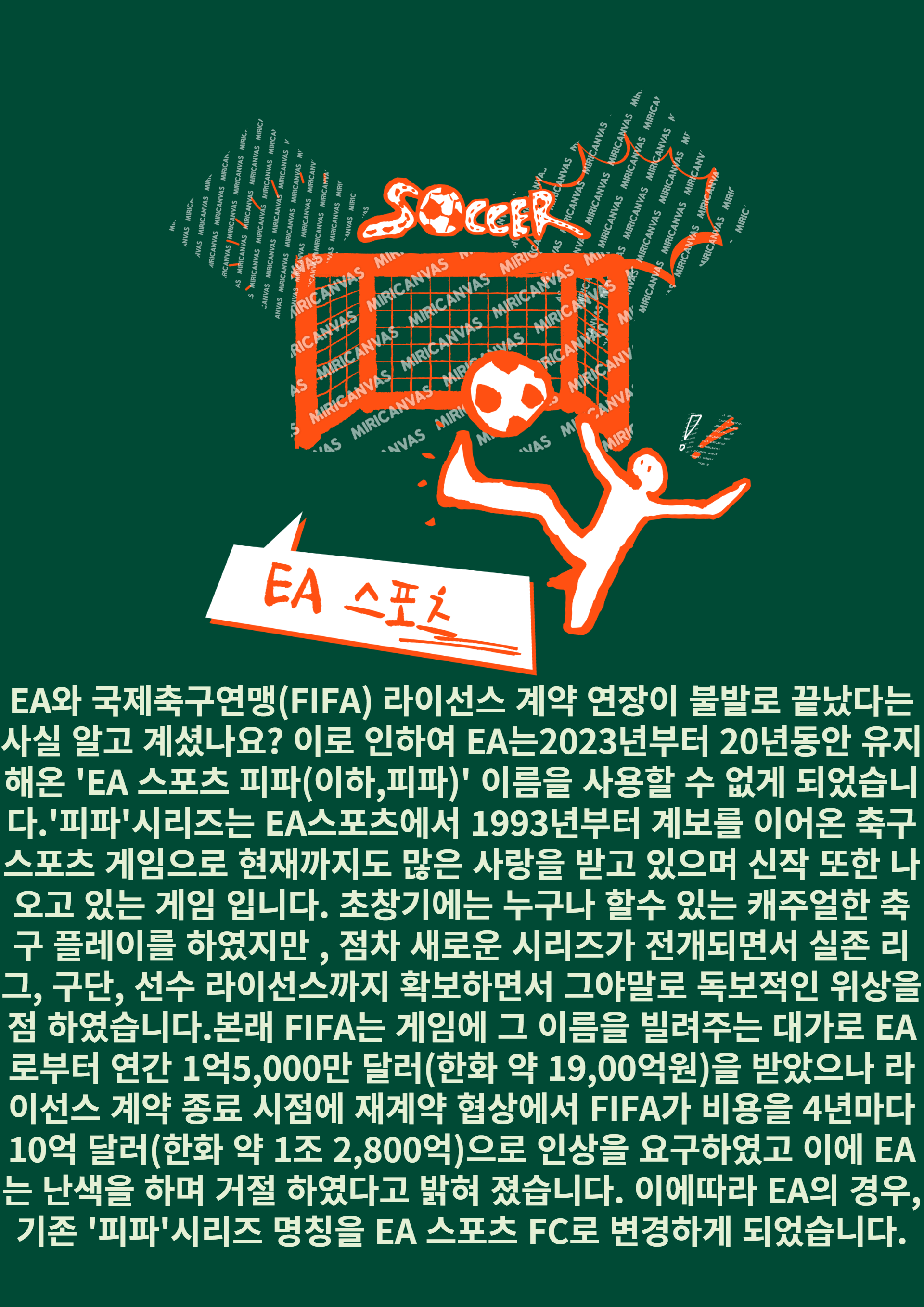EA와 국제축구연맹(FIFA) 라이선스 계약 연장이 불발로 끝났다는 사실 알고 계셨나요? 이로 인하여 EA는2023년부터 20년동안 유지해온 'EA 스포츠 피파(이하,피파)' 이름을 사용할 수 없게 되었습니다.'피파'시리즈는 EA스포츠에서 1993년부터 계보를 이어온 축구 스포츠 게임으로 현재까지도 많은 사랑을 받고 있으며 신작 또한 나오고 있는 게임 입니다. 초창기에는 누구나 할수 있는 캐주얼한 축구 플레이를 하였지만 , 점차 새로운 시리즈가 전개되면서 실존 리그, 구단, 선수 라이선스까지 확보하면서 그야말로 독보적인 위상을 점 하였습니다.본래 FIFA는 게임에 그 이름을 빌려주는 대가로 EA로부터 연간 1억5,000만 달러(한화 약 19,00억원)을 받았으나 라이선스 계약 종료 시점에 재계약 협상에서 FIFA가 비용을 4년마다 10억 달러(한화 약 1조 2,800억)으로 인상을 요구하였고 이에 EA는 난색을 하며 거절 하였다고 밝혀 졌습니다. 이에따라 EA의 경우, 기존 '피파'시리즈 명칭을 EA 스포츠 FC로 변경하게 되었습니다.