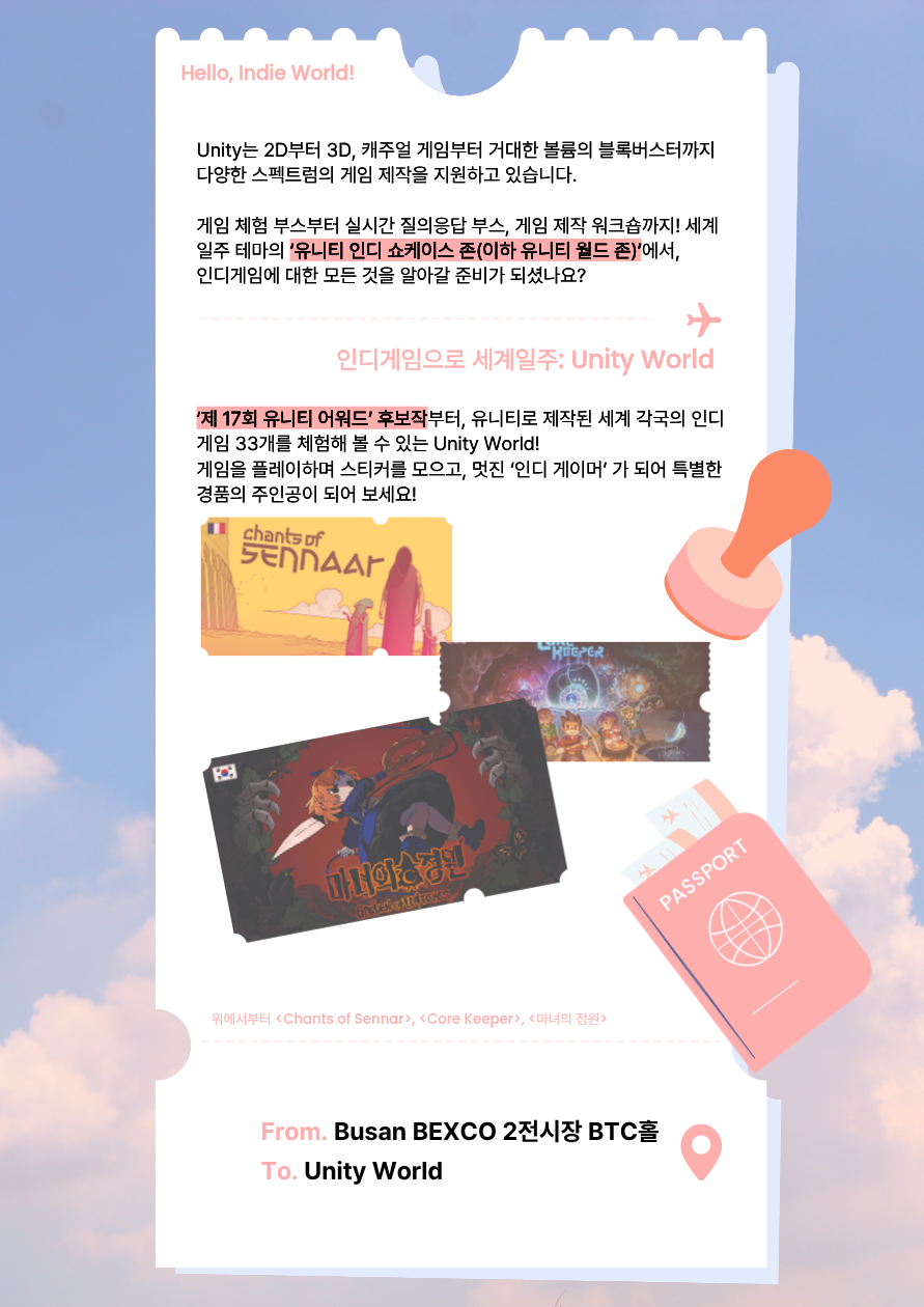 협동 게임의 대작 <Core Keeper>부터, ‘제 17회 유니티 어워드’ 후보작에 선정된 국내 인디게임까지! 유니티로 제작된 세계 각국의 인디게임 33개를 체험해 볼 수 있는 Unity World! 게임을 플레이하며 스티커를 모으고, 멋진 ‘인디 게이머’ 가 되어 특별한 경품의 주인공이 되어 보세요!